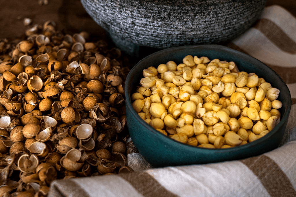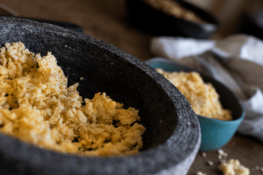 Now, a few more hours later, you have an even smaller bowl full of kernels. Excellent! Now, using that molcajete, smash and grind the kernels into a pulp. This helps to more effectively extract all of those hydrocyanic acids once in the water—and yes, make the job of straining and changing the water even more difficult if they had been left whole. Easy peasy, right? No, don’t answer that.