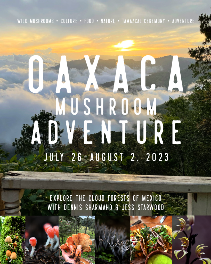 The seven day Oaxaca Mushroom Adventure, led by mushroom book author and wild foods chef Jess Starwood and botany expert Dennis Sharmahd, is here and open for registration. We explore the cloud forests of mainland Mexico at elevations from 8,000-10,000 feet in search of wild mushrooms and learn about the local culture and customs with the fungi. We will also enjoy the delicious foods and drinks that the area is known for such as moles, tlayudas, tamales, and mezcal. We will hike among the conifers, broadleaf trees, ferns and agaves with our guides to find a variety of mushroom species and learn about their edibility and traditional uses. A traditional tamazcal (sweat lodge) and medicine ceremony is offered, but is optional. We will spend our time in the Cuajimoloyas and San Mateo Rio Hondo areas along with some time in the city of Oaxaca.