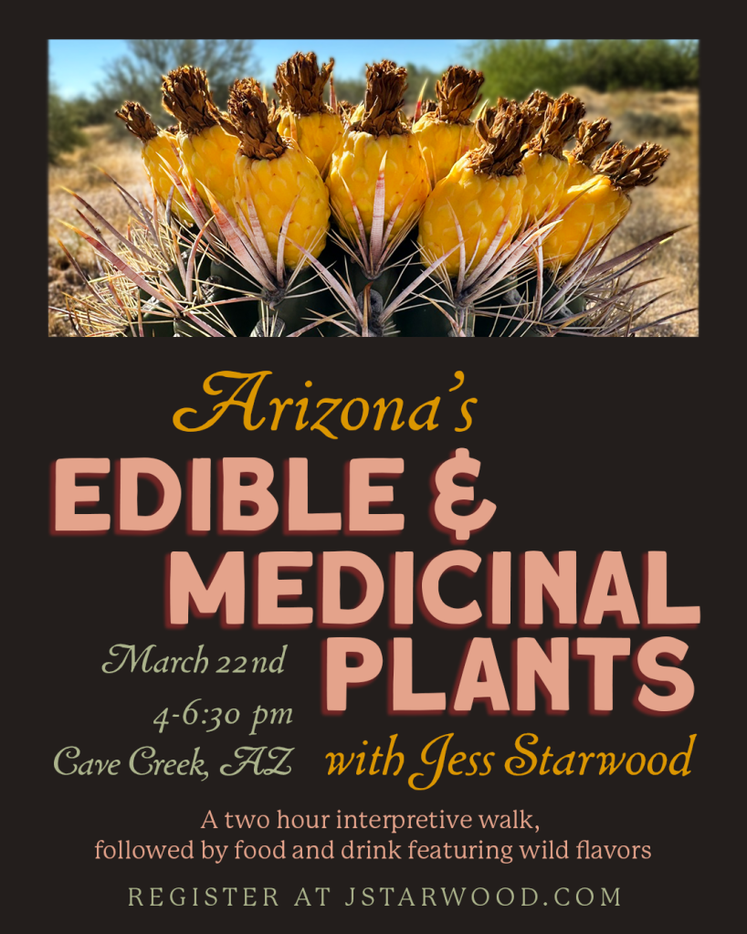 This immersive class starts with an interpretive walk through the Sonoran Desert’s desert scrub and riparian biomes. You will be introduced to the wild edible and medicinal plants and fungi of the season and region.