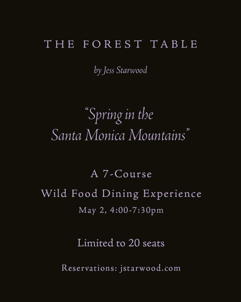 A unique 7-course wild food dining experience on a private estate tucked away in the Santa Monica Mountains. Each course will feature the region’s wild flavors and the season that celebrates this time and place. Exclusively limited to 20 seats.